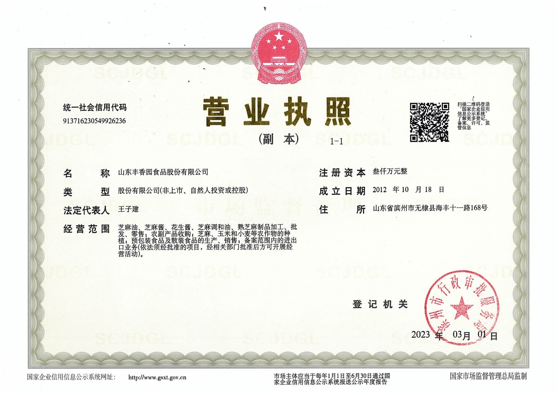 山東豐香園食品股份有限公司位于無棣縣西城工業園,成立于2012年,注冊資本3000萬元,員工60多人,年銷售收入8000多萬元,是“國家高新技術企業”、“中國好糧油”示范企業、“食安山東”示范生產加工企業,公司集綠色、有機芝麻食品標準化、生產加工、研發、出口銷售為一體的山東省農業產業化“重點龍頭企業”。